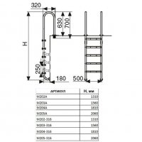 Лестницы для бассейнов изготавливаются из полированной нержавеющей стали AISI-316, отличающейся высокой сопротивляемостью коррозии и окислению. Ступени лестницы одинарные с антискользящими накладками. Соответствуют международным стандартам. Для удобства монтажа лестницы снабжены закладными деталями. Диметр трубы поручней 42 мм.