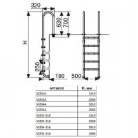 Лестницы для бассейнов изготавливаются из полированной нержавеющей стали AISI-316, отличающейся высокой сопротивляемостью коррозии и окислению. Ступени лестницы одинарные с антискользящими накладками. Соответствуют международным стандартам. Для удобства монтажа лестницы снабжены закладными деталями. Диметр трубы поручней 42 мм..