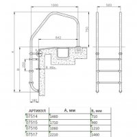Ширина лестницы 500 мм. Поручни изготовлены из нержавеющей стали диаметром 43 мм. Поставляется с анкерными креплениями и заземлением. Выполнена в соответствии со стандартами EN 13451-1 и EN 13451-2. Поручни и нескользящие ступеньки из нержавеющей стали AISI-316.