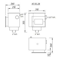 Имеет подсоединение с резьбой 2" В.Р. (Аварийный перелив 1 1/2" В.Р., автодолив воды 1/2" Н.Р.).
